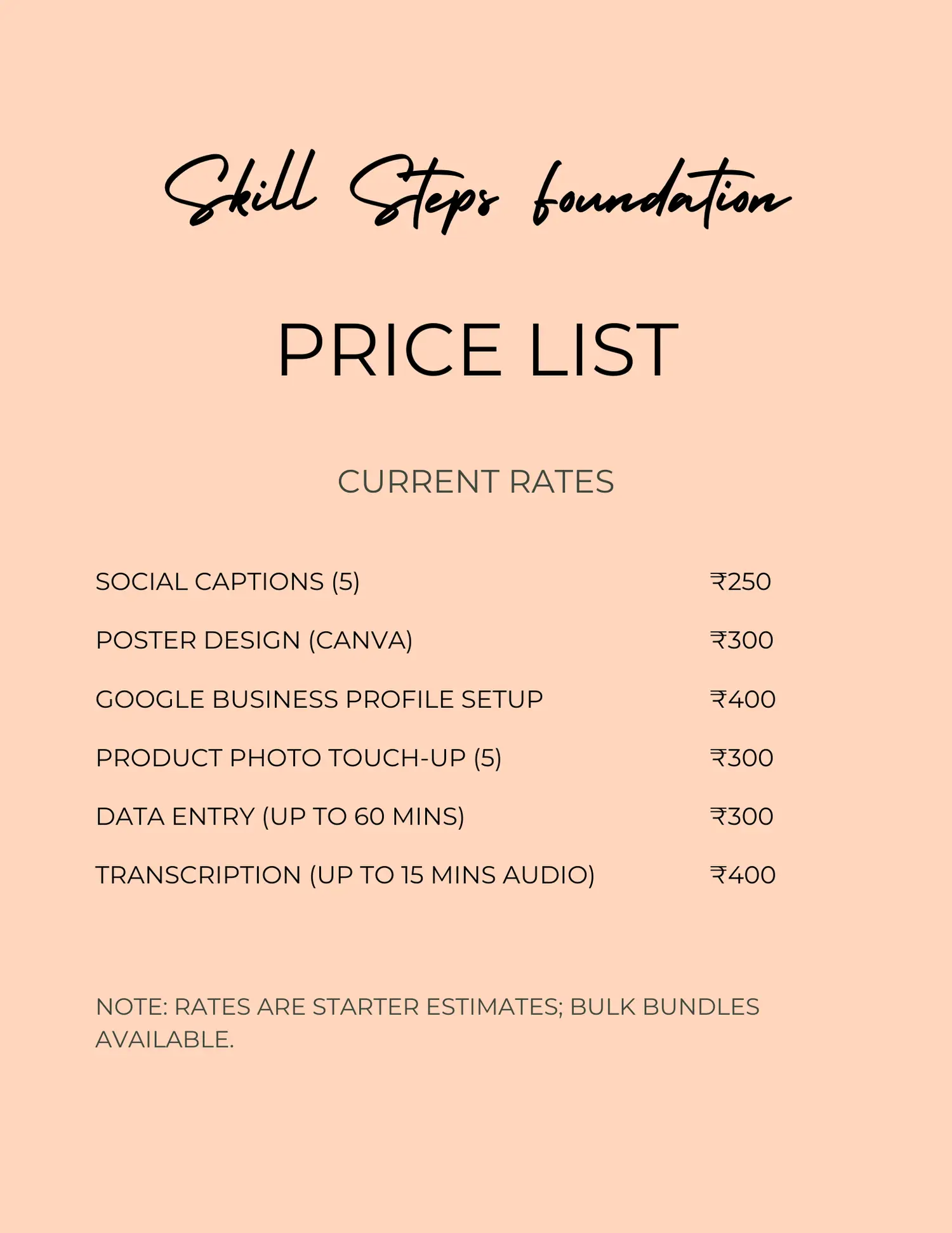 Skill Steps Foundation bridges the gap by connecting underprivileged youth and women to meaningful digital tasks, helping them support their families while fulfilling your business needs with precision and care.